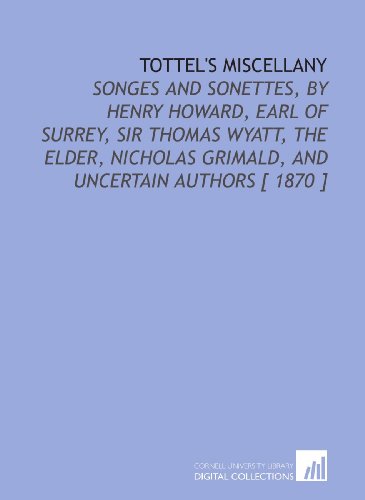 | 8. Tottel's Miscellany: Songes and Sonettes, by Henry Howard, Earl of Surrey, Sir Thomas Wyatt, the Elder, Nicholas Grimald, and Uncertain Authors [ 1870 ] by Richard Tottel | |